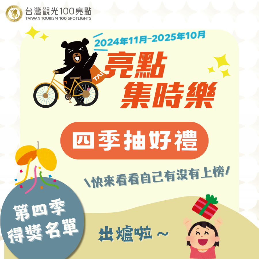 台灣觀光 100 亮點 第四季「四季抽好禮」中獎名單公告恭喜所有幸運得主👏