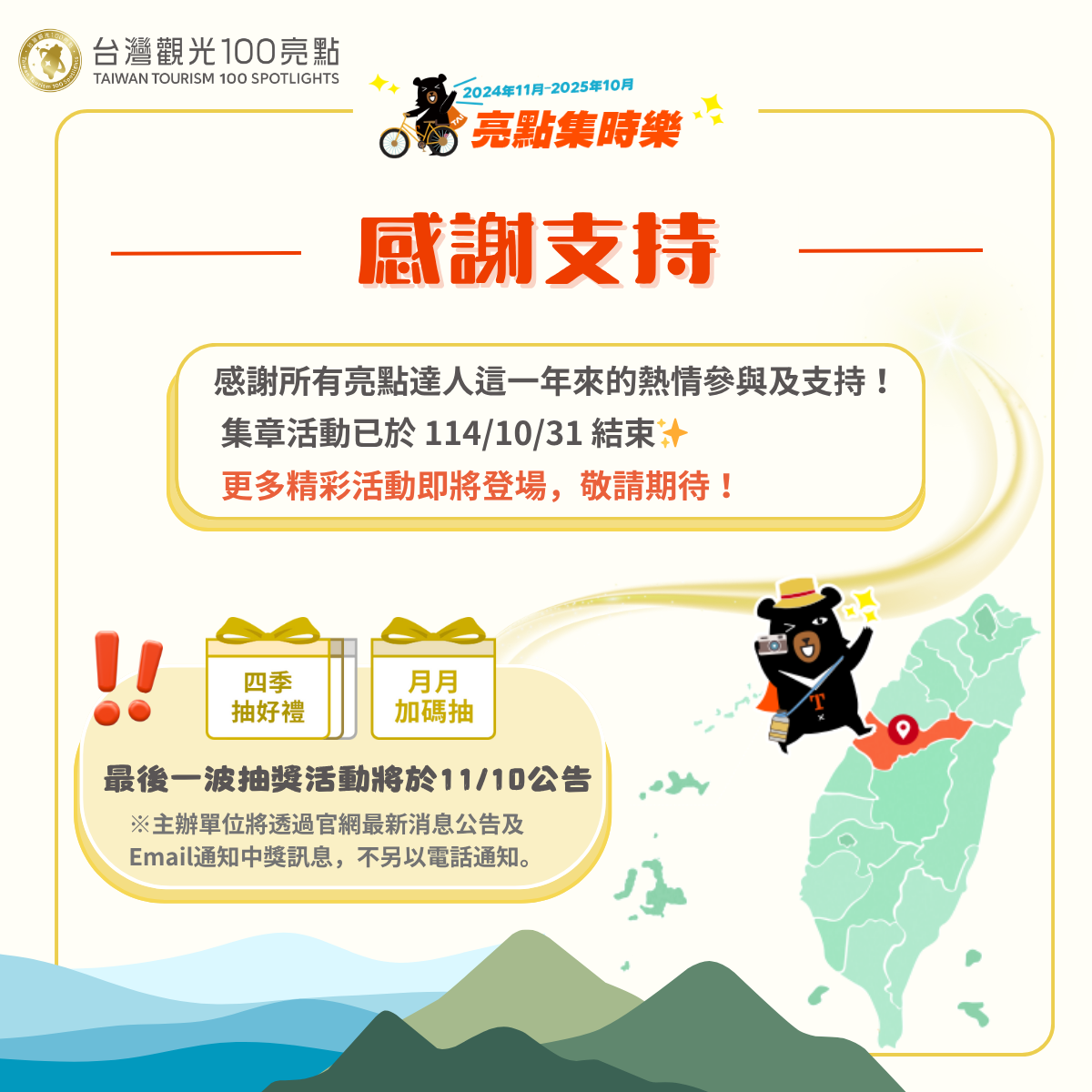 最後一波抽獎活動將於11/10公告 ※主辦單位將透過官網最新消息公告及Email通知中獎訊息,不另以電話通知。